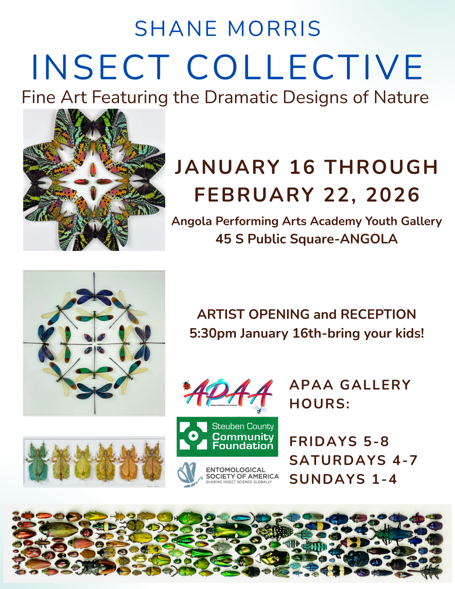 | 1/16/2026 -2/22/2026 | APAA Gallery Features: Insect Collective by Shane Morris This exhibit features a unique artist who creates striking pieces using vintage insect collections. We think this is an especially great opportunity for children or adults that have a specific interest in entomology and bugs—kids tend to find it very cool! The artist will be at the opening to answer questions and take photos. more info... |