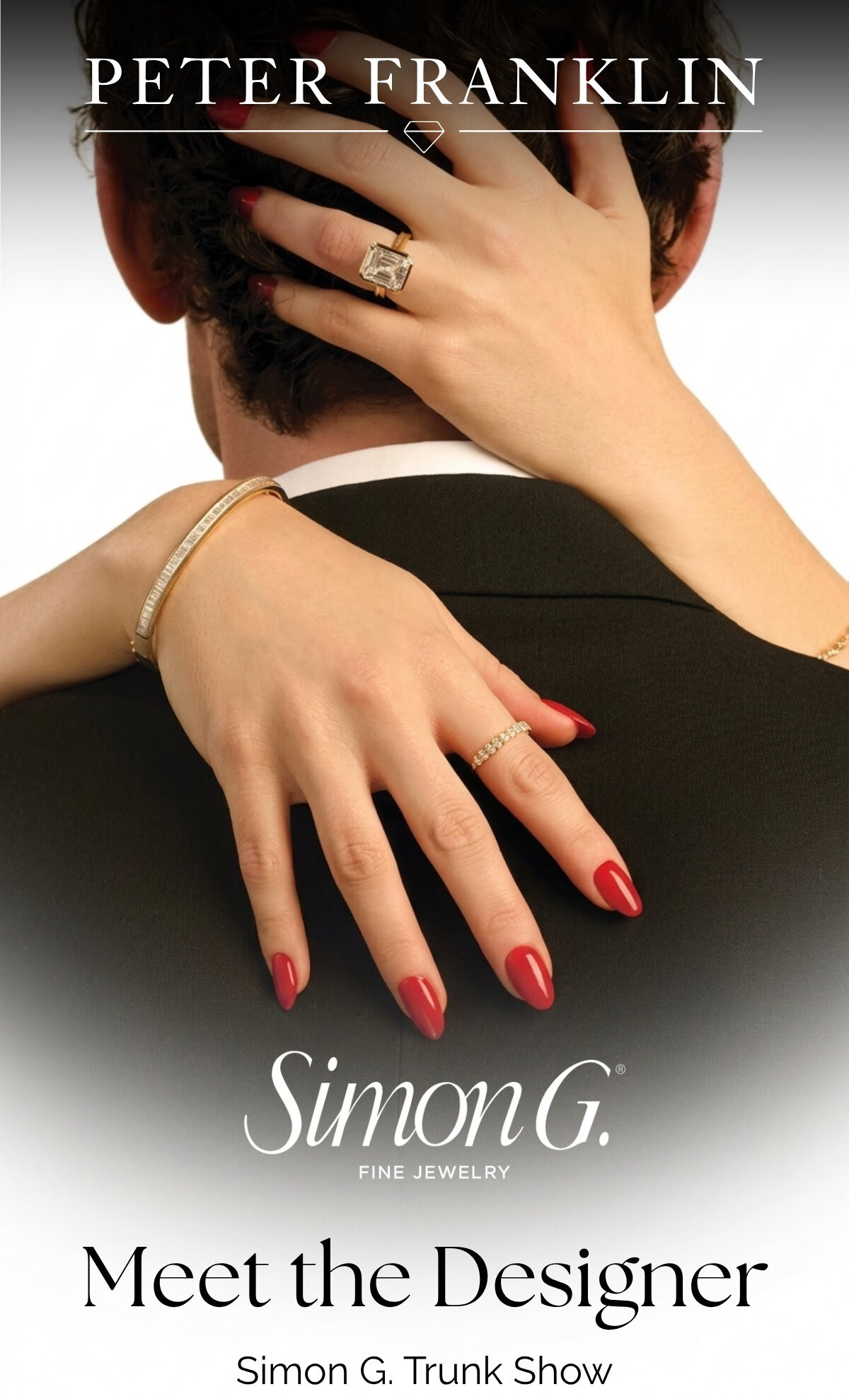 | 5/1/2026 | Simon G. Trunk Show Explore an exclusive showcase of Simon G designs, including rare pieces not available in store. Simon G is renowned for jewelry that captures the full spectrum of feminine beauty — engineered with extraordinary craftsmanship and bold design. Each piece reflects meticulous attention to detail, from the elegant curves of a setting to the brilliant placement of every stone.