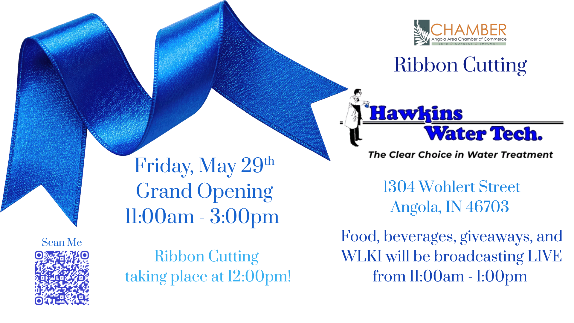 | 5/29/2026 | Hawkins Water Tech Ribbon Cutting Join us for Hawkins Water Tech Grand Opening and Ribbon Cutting ceremony. The ribbon cutting ceremony will take place at noon. 📅 Date: Friday, May 29, 2026 This is a Grand Opening Celebration! The full event will be from 11:00am - 3:00pm and the Ribbon Cutting ceremony will take place at 12:00pm. Make sure you pop into the offices to find out how Hawkins Water Tech can help with all your home water needs. This is an excellent opportunity to support your fellow members. If you are not yet a Chamber member and are interested in learning more, we’d love to chat with you about the many benefits of membership and the events we host throughout the year. Give us a call at 260-665-3512 — we’re happy to help! RSVP by April 30th! Click the button below or contact the Chamber at officeadmin@angolachamber.org or 260-665-3512 for any inquiries. more info... |