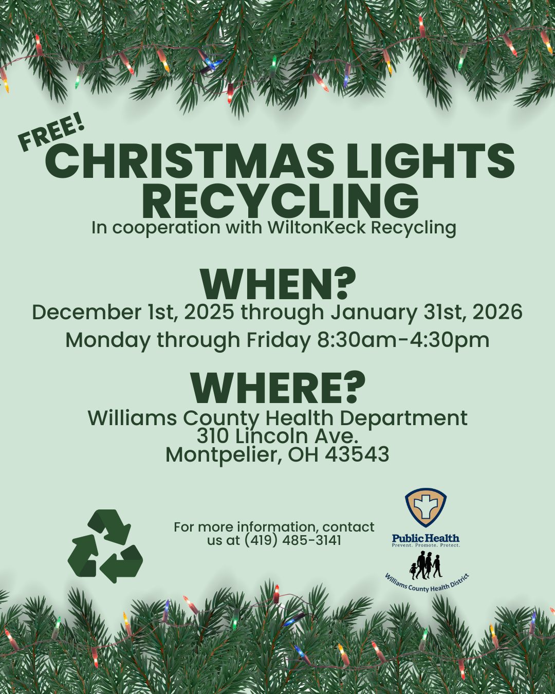 | 1/6/2026 -1/31/2026 | Recycle Christmas Lights Taking down the tree? Don't throw away those non-working lights. Recycle them instead. We're accepting lights at the Williams County Health Department through January 31, 2026