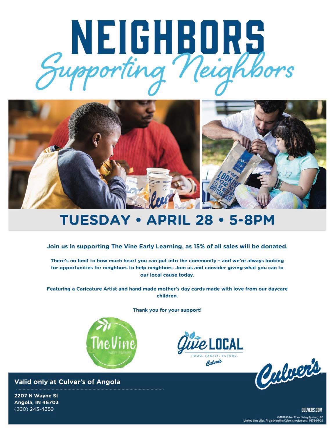 | 4/28/2026 | Neighbors Supporting Neighbors Join us Tuesday, April 28 from 5–8PM at Culver’s in Angola to support The Vine Early Learning, Inc.! 15% of all sales will be donated to help their incredible work right here in our community. PLUS—enjoy a caricature artist and sweet, handmade Mother’s Day cards created by the local kiddos. Grab dinner, bring a friend, and give back while you’re at it! more info... |