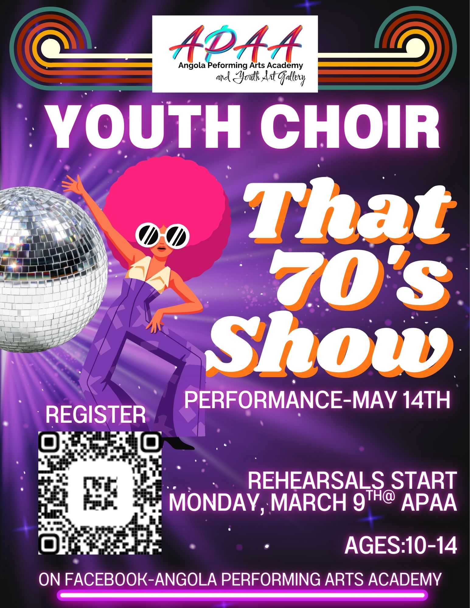 | 5/14/2026 | That 70s Show - an APAA Youth Choir Performance Celebrate 1970's with this high energy show with youth! Rehearsal are March 2,9,16; April 13,20,27; May 4,11-Dress Rehearsal May 13th and Show May 14th. Youth 10-14 can participate. All are welcomed. T-shirts, Music and all necessary items included. REHEARSALS ARE 6:30-7:50-8:00 pickup. more info... |