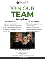 Ad Title:Panache SalonSpa - Front Desk Location: Angola, IN Post Date: 09/16/25 City: Angola State: IN Zip: 46703 Phone (W): 260-665-2674 Email:customerservice@panache-salonspa.com Description: Hiring for front desk guest coordinator position. Stop in and see us, decide if we are your next career or part-time position. Hours are Monday, Wednesday Thursday and Saturday. We are making room for some exciting services that we are offering in salon--Skin and body waxing services, and some excitement over Nails! Call for an appointment today!!