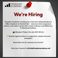 Ad Title:Freedom Academy - Administrative Assistant Location: Kendallville, IN Post Date: 11/14/25 Contact: Kristie Trick City: Kendallville Email:ktrick@freedomacademy.net Description: Freedom Academy is looking for a full-time Administrative & Office Assistant in Kendallville - Someone who is organized, driven, and ready to grow with team making a real difference in Northeast Indiana.
