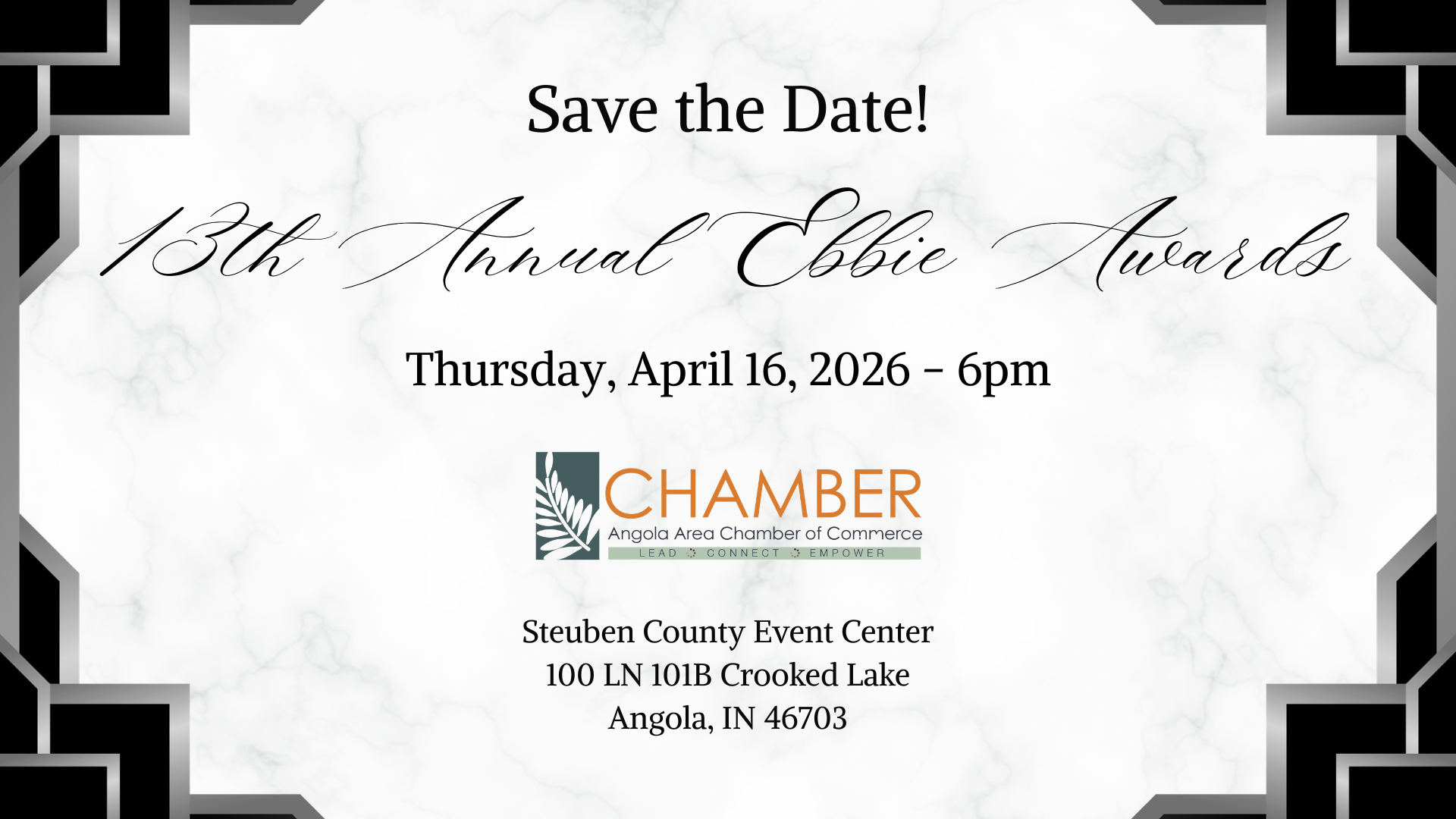 Join the Chamber for our 13th Annual Excellence in Business Accolades, aka, the Ebbie Awards, on Thursday, April 16, 2025 where we will be celebrating the "best of the best" of the Angola Area Chamber business community in an Oscar-style celebration. Rooted in Community - Growing Toward Tomorrow.