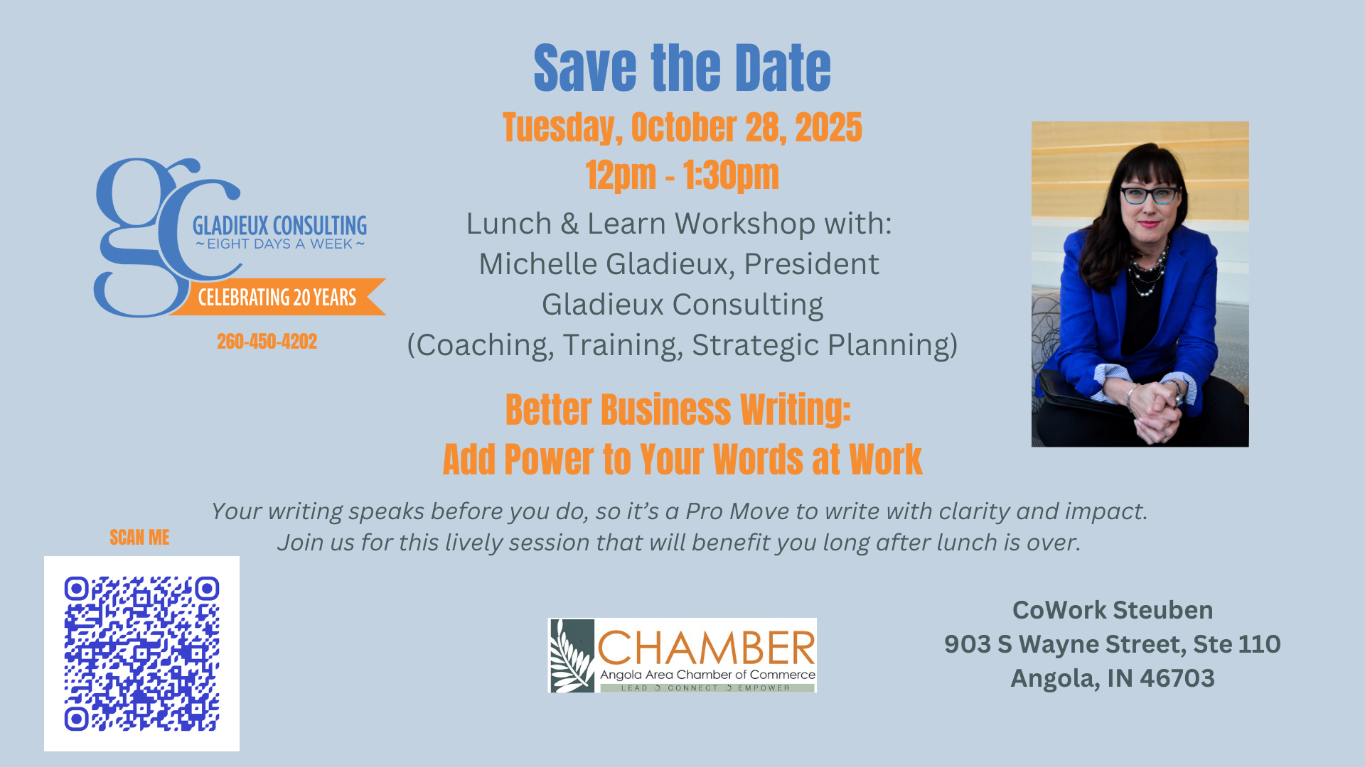 Your writing speaks before you do—make sure it speaks well! In this engaging workshop, Michelle Gladieux will share practical strategies to help you write with clarity and impact. Learn how to craft messages that influence how others perceive you and strengthen your professional presence.